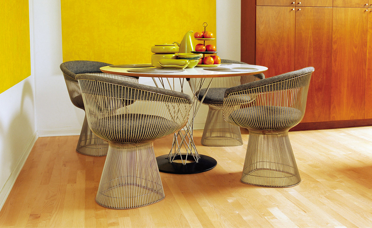 1966年榮獲 American Institute of Architects International Award 美國建築協會國際大獎的 Platner Chair,在設計師 Warren Platner 的創意下,將鋼絲雕塑轉化成一系列收藏級的傢俱,創造了現在被認為是當今時代的設計圖標。
