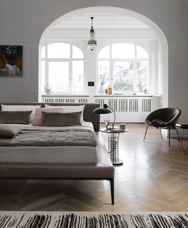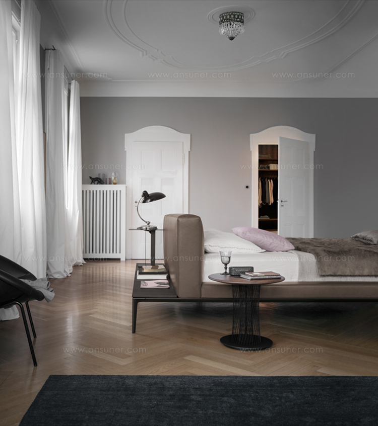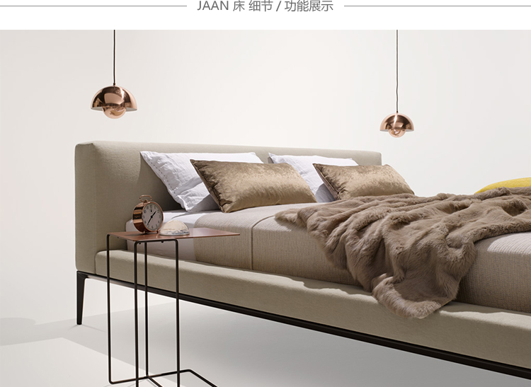 JAAN床最引人注的是它迷人的魅力,非常的柔软,非常的休闲。诗歌以简洁的线条形式出现。柔软的皮革或者天然织物构成床头板和软垫框架。完美的细节,精心打造。