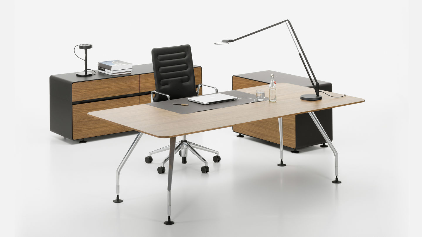 行政办公室计划包括一张大桌子和三个不同的储物家具。 所使用的材料,如铝,木材和皮革,质量特别高,精心制作到最后的细节。 凭借其建设性的轻盈和设计优雅,该计划可以与Ad Hoc办公系统,AC 4椅子(均由Antonio Citterio设计)或Vitra系列经典系列完美结合。