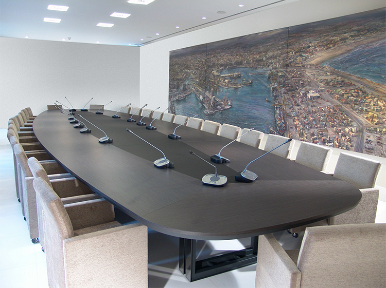 会议桌。椭圆形顶部,直头和Techno Leather软垫中央区域。50毫米厚的顶部,由顶盖和带45o斜边的底盖组成。底座由两个双框金属腿组成。表面处理:顶部采用木材,微纹理漆或Techno Leather的室内装潢。双框腿采用微纹理漆,外部表面采用不锈钢表面处理。