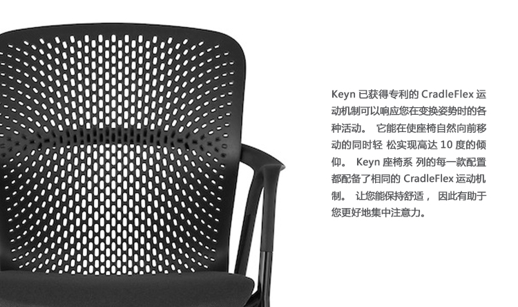 Keyn座椅系列是一套会议和单椅的组合,能为协作式的空间提供响应式的运动机制和即时的舒适感。由伦敦设计团队forpeople设计的这款产品,使用了四个关键部件来创作此系列中的每个型号的产品,所以每款产品都能保持一样的视觉吸引力。Keyn的CradleFlex运动机制能响应姿势的变换,倾仰角度可达10度,能为您带来令人愉悦的舒适感