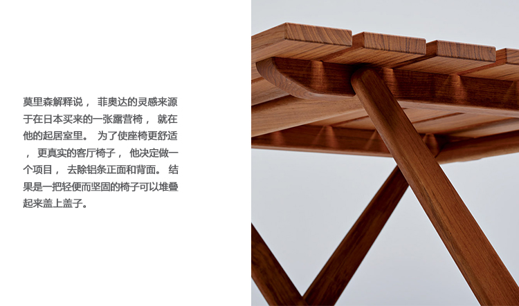 莫里森解释说,菲奥达的灵感来源于在日本买来的一张露营椅,就在他的起居室里。为了使座椅更舒适,更真实的客厅椅子,他决定做一个项目,去除铝条正面和背面。 结果是一把轻便而坚固的椅子可以堆叠起来盖上盖子。