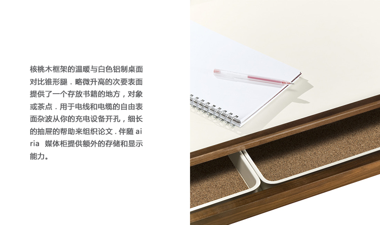 从优雅的木材和铝材组合到精心制作的细节,如软木衬里抽屉,Airia将美观与功能完美结合。 设计师Ayako Takase和Cutter Hutton的动机是设计一个“智能桌面,承认技术和我们在工作时积累的东西,但是以微妙,集成和直观的方式进行。”
