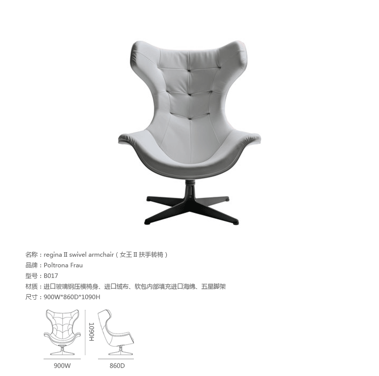 Regina II Swivel Armchair(女王II 扶手转椅)是设计大师Paolo Rizzatto设计的可旋转扶手椅,女王扶手椅设计尊贵典雅,造型时尚大气,如同女王权利圣神不可侵犯,坐在其上,您不仅仅能拥有舒适的感觉,还能得到尊贵的感受。制作采用进口玻璃钢压模椅身、进口绒布、软包内部填充进口海绵、五星脚架。