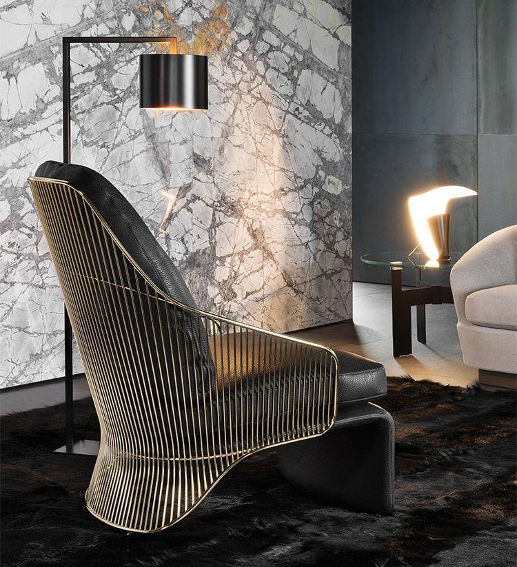 这款扶手椅十分引人注目,充满上世纪中叶的优雅气质,那一时期的产品将实验性的造型设计与精致的装饰风格完美融合在一起。