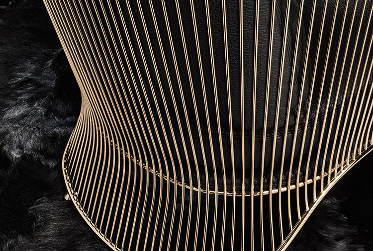 Colette扶手椅的制造过程相当复杂。外部的金属构架经过压延和装配,焊接点超过三百个。特殊的金属表面源于在淡金色的液池中进行电镀的工序以及透明的保护涂层,在此基础上拥有刚度和深度。座椅结构前方搭配地面支撑件,采用聚氨酯泡沫制成,内部插入金属件,绑带的设计使其具有一定的弹性,从而保证绝佳的舒适度。 坐垫和靠背完美搭配构架的设计。