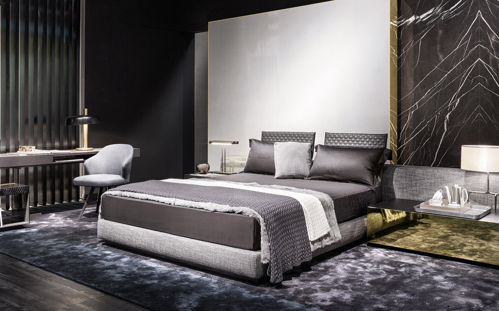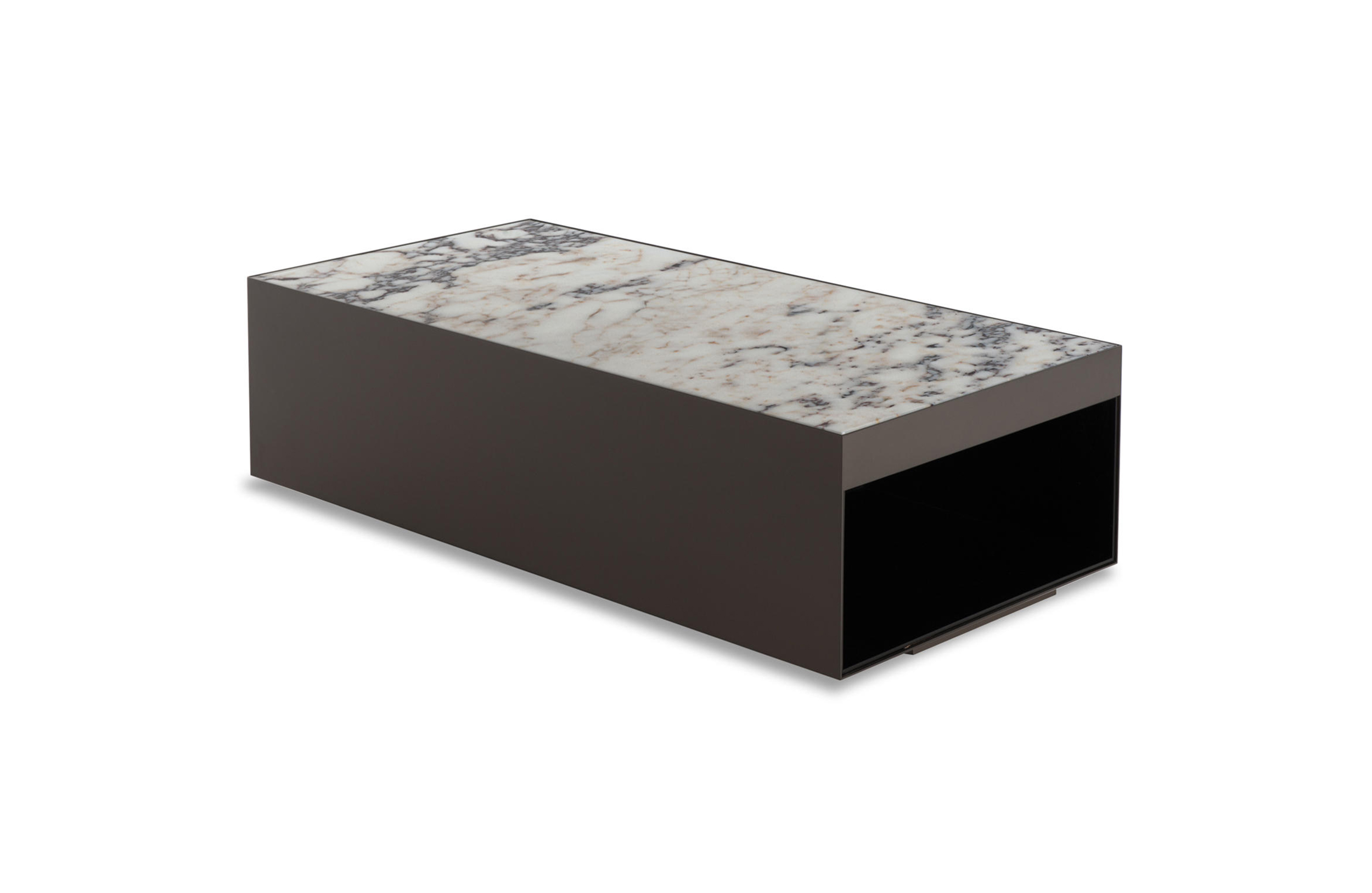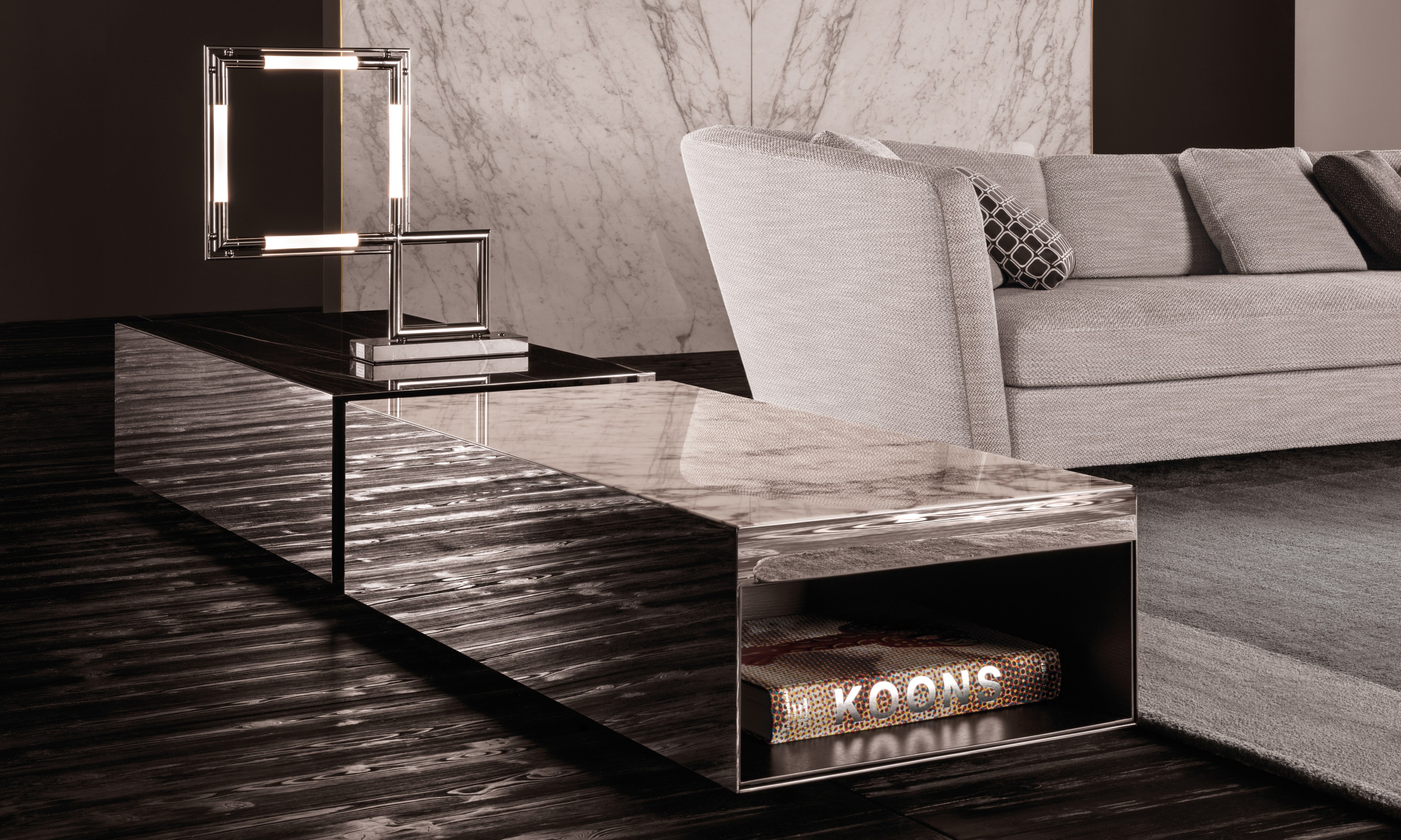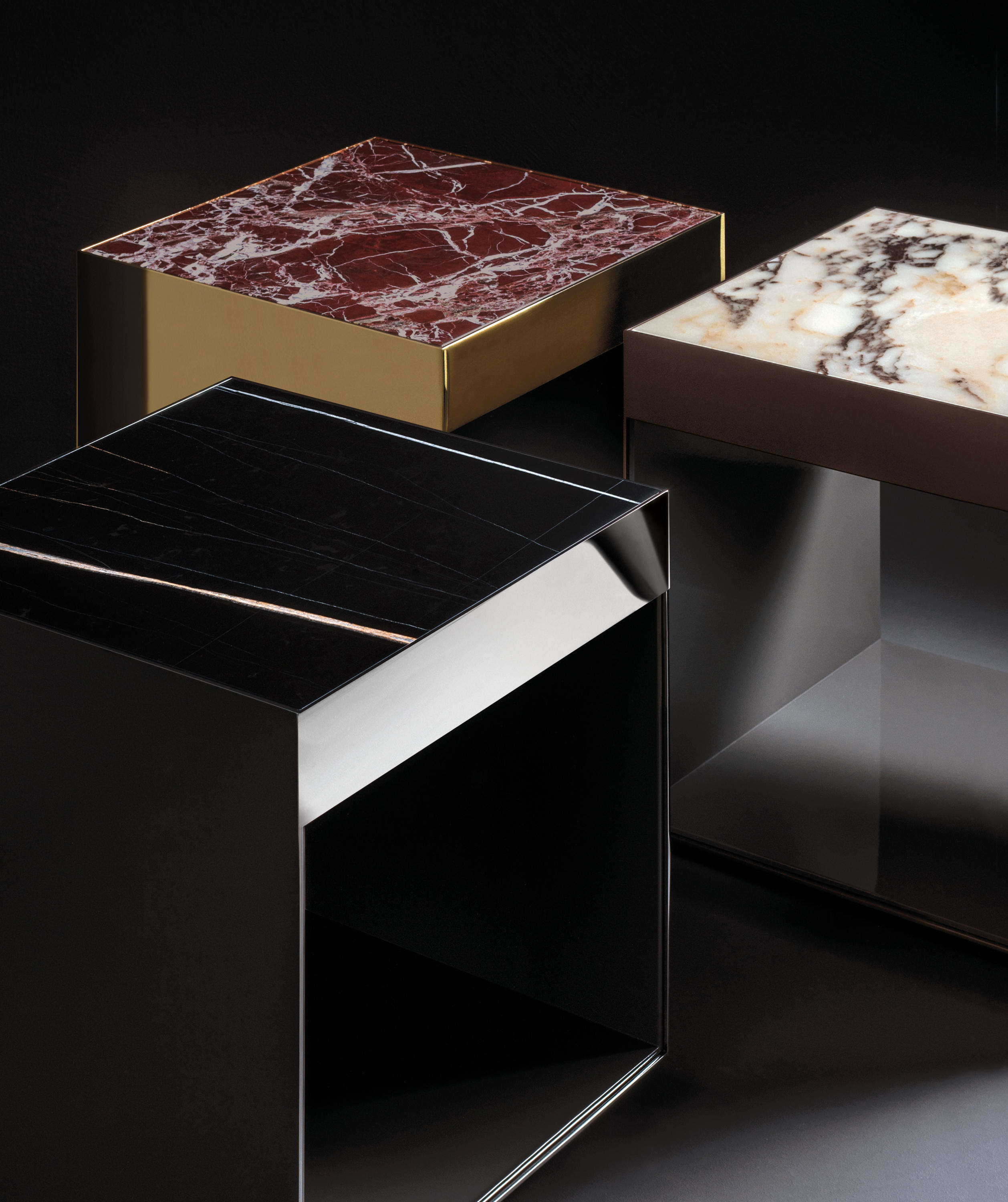 这是用于收纳贵重物品的边几系列,拥有纯粹而简洁的美学设计,有着精美绝伦的多种材质组合。这一边几家族拥有华贵的美学特质,因而也有着非同一般的功能,在提供实用置物表面的同时,呈现精美的装饰效果,具有50年代和60年代的米兰设计风格。金属构架的表面有亮铬色、亮金色和亚光铜色,嵌入构架的台面可谓画龙点睛,选用多种珍稀的大理石材质,其中包括Arabescato Purple、Sahara Noir和Rosso Levanto,或是Moka色的白蜡木、Moka色橡木。从建设性的角度来看,Elliott边几的内部储物空间可以用于摆放杂志或其他物件,有花岗石色的亮面漆或Moka色开孔橡木可供选择。金属材质的外部框架搭配包覆木质的内部框架,以此可以看出工艺的复杂性,同时平添一份温暖的质感,展现Elliott边几的名贵特质。