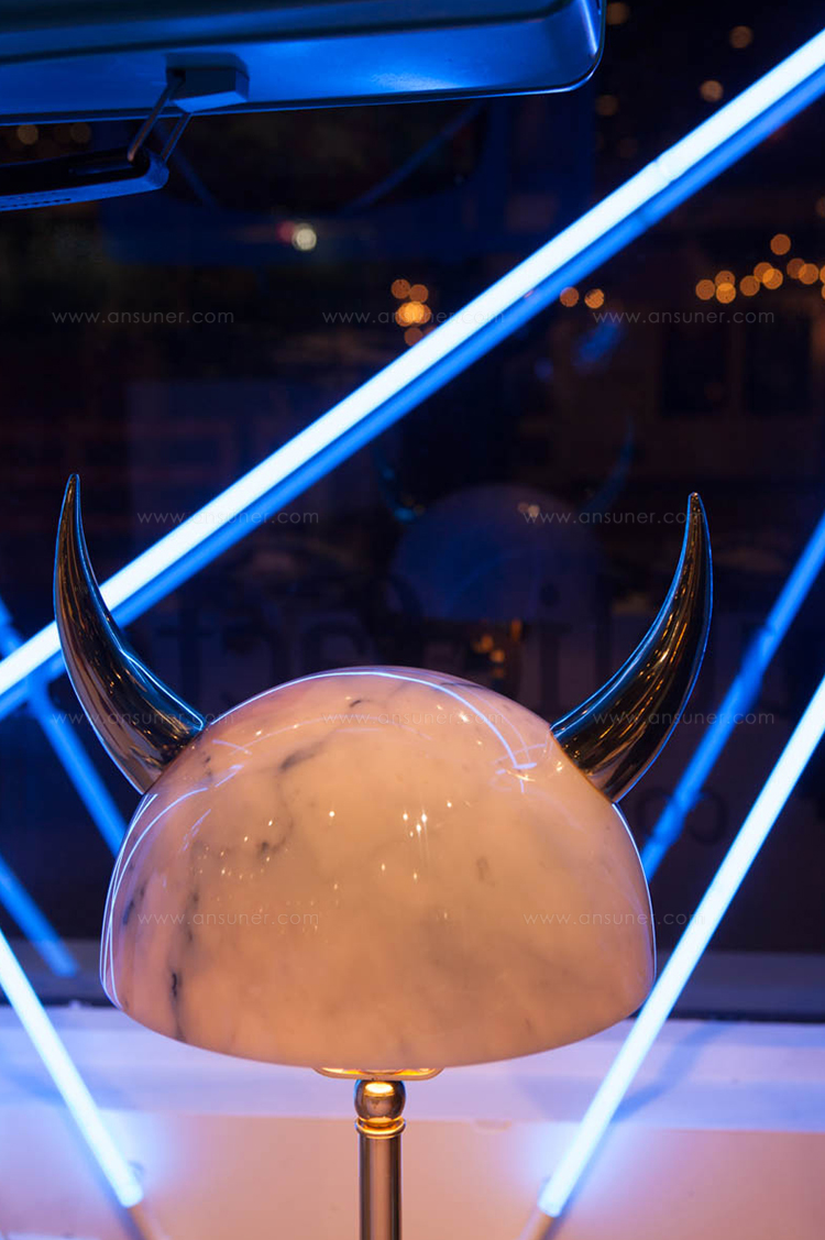 “Min Lilla Viking”(My Little Viking)台灯向老式斯堪的纳维亚战士头盔致敬。 它与现代风格的形状和风格相呼应。 金属盔甲和骨头已被大理石和抛光黄铜所取代,使这种野蛮的象征更加优雅。 当点燃时,Carrara和Afyon大理石通过揭示类似行星的石头的丰富自然纹理使观众感到惊讶。 “Min Lilla Viking”是将在不久的将来发布的一款严肃的漫画台灯中的第一款。