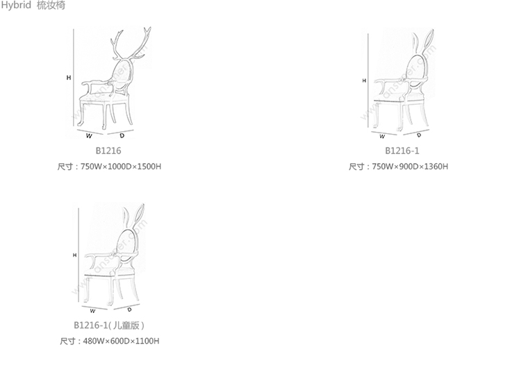 Hybrid 鹿角梳妆椅 系列尺寸/示意图