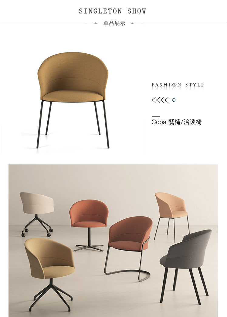 Copa是Viccarbe不懈追求非凡舒适的结果。新款Ramos-Bassols椅子采用蜿蜒曲折的线条设计,配有多种底座。凭借其多功能性和对空间的适应性,它始终坚持舒适作为共同点。这款剪影灵感源自优雅水晶玻璃的造型,完美体现了David Ramos和Jordi Bassols的当代设计理念。这款新椅子是一款定型,温暖,悦目的产品,为Viccarbe提供最舒适的座椅。