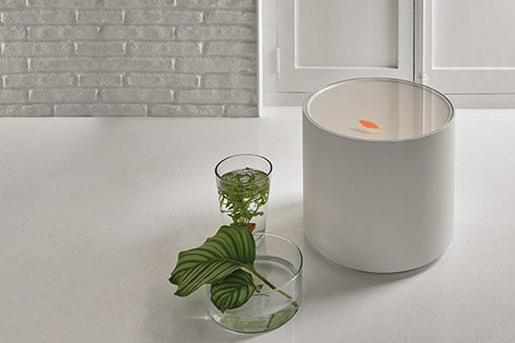 奇异空间的微妙选择,鱼漂浮在漆成的圆柱体中,除了自身外没有其他装饰。