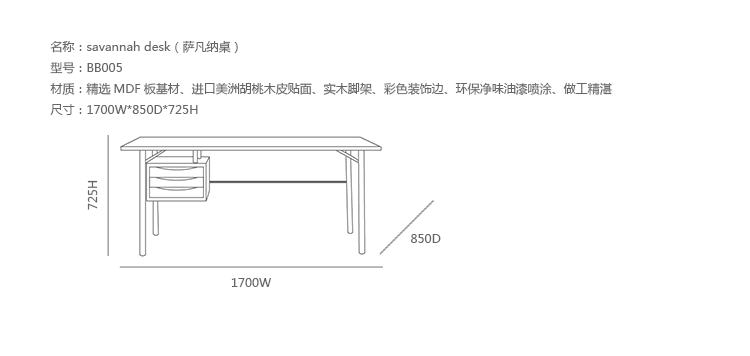 savannah desk(萨凡纳桌)是您一直在寻找的家具,它色彩缤纷,设计时尚经典,物美价廉,制作采用精选MDF板基材、进口美洲胡桃木皮贴面、实木脚架、彩色装饰边、环保净味油漆喷涂,做工精湛细致,品质一流。