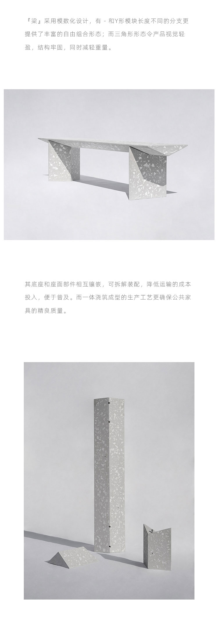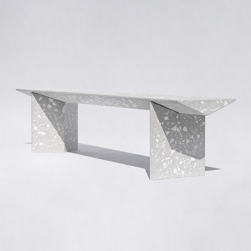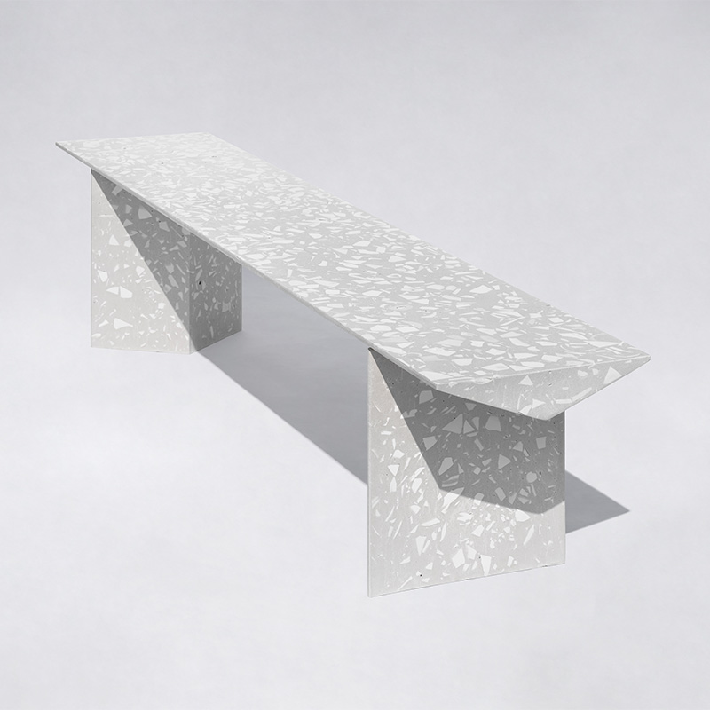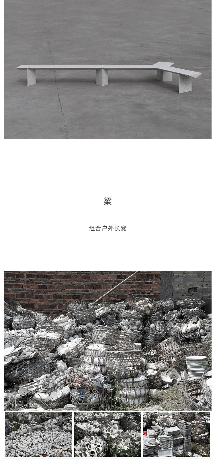 『梁』组合式户外长凳是一款回收应用日用陶瓷废料的混凝土公共家具,它提出一种积极、平实、极具社会性的『可持续化』日常。 将中国本土庞大的日用陶瓷废料存量引入材料开发应用中,替代天然大理石骨料,经济环保;而陶瓷废料的原本形态被转化为产品独特的视觉语言,更显真实自然。