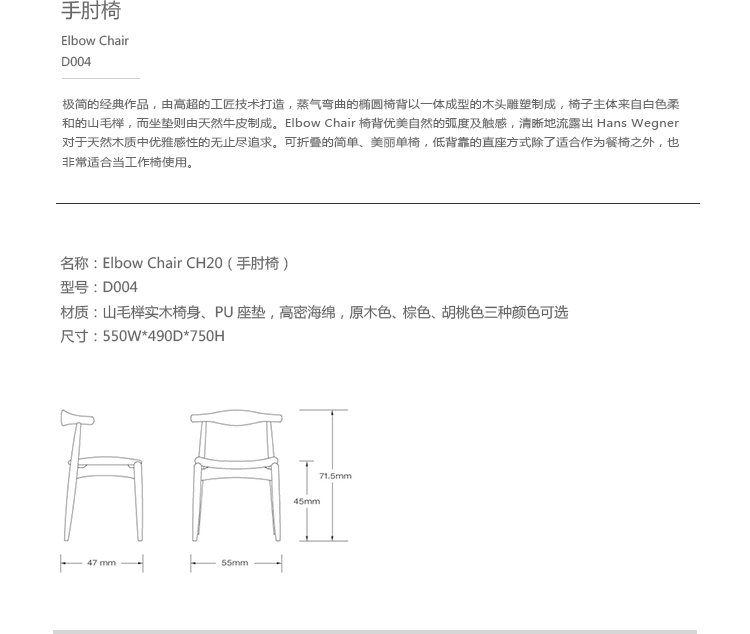 極簡的經典作品,由高超的工匠技術打造。蒸氣彎曲的橢圓椅背以一體成型的木頭雕塑製成,獨特的坐墊底部由11層的原木層壓板製成,提供了卓越的穩定性。椅子主體來自白色柔和的山毛櫸,而坐墊則由天然牛皮製成。Elbow Chair 椅背優美自然的弧度及觸感,清晰的流露出 Hans J. Wegner 對於天然木質中優雅感性的無止盡追求。