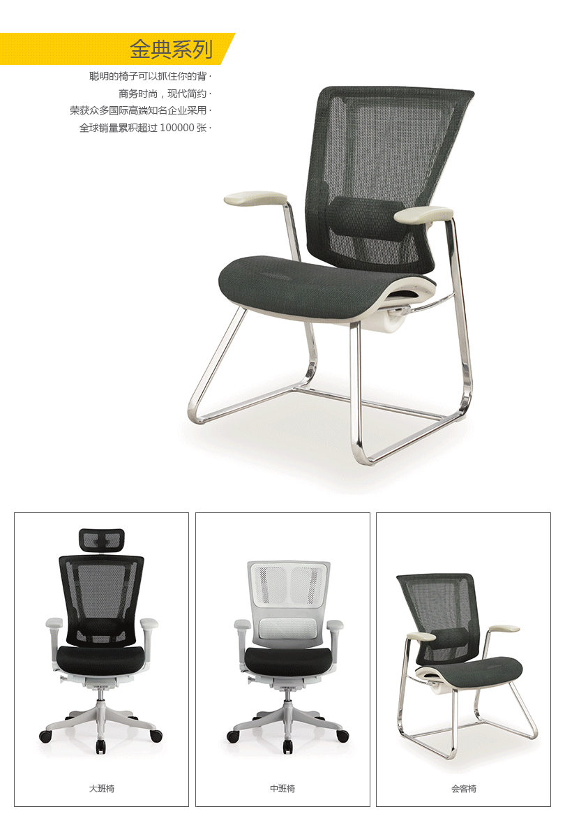 金典系列产品灵活度高,外观设计时尚,通过单杆操控多功能调整系统,使操控简便更人性化。优良的设计及精湛的力学与工学设计概念与一身,金典系列产品设计居于办公座椅行业前列,智慧移动腰背支撑系统,你怎么动他就怎么动。