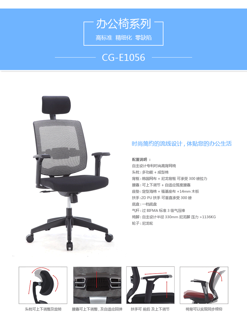 CG-E1056办公椅是一款符合人体工学的全功能性办公椅,力求使用者能充分理解其人性化的设计及达到最舒适的调节。