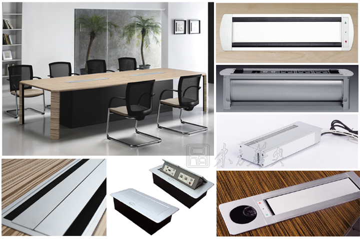 ※ 上图为会议台的过线系统介绍:可以选择如图的手动线盒、电动线盒、以及毛刷翻盖线盒,适合你不同的办公需要,内部可配置动功能三插电源孔、网络接口、耳机音频接口、话筒接口、VGA接口,也可根据客户实际需要选择和定做。