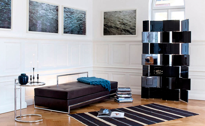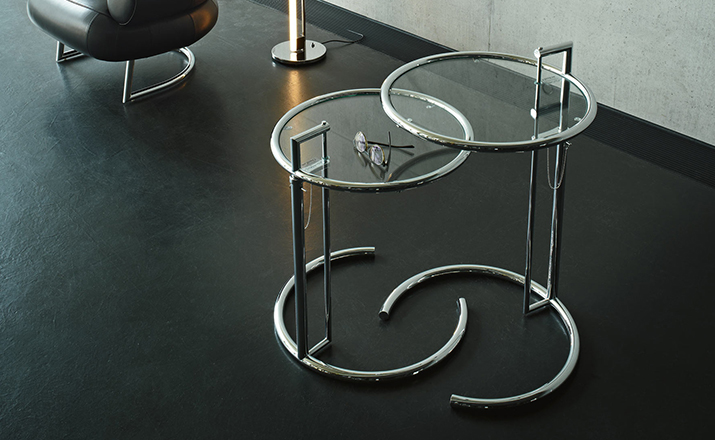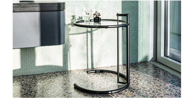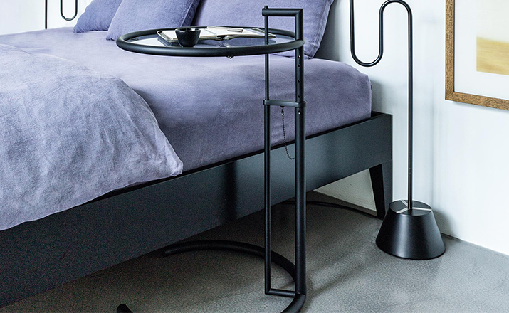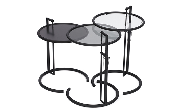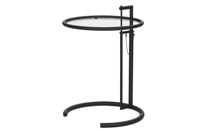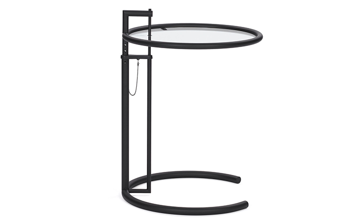 In the 1920s Eileen Gray experimented with various versions of the design of the Adjustable Table E 1027. As she changed the look of the table with a black metal top as an alternative to the crystal glass top, she also selected black as the colour for the frame. The matte black lacquer clearly emphasises the lines of the table and its form – a version she considered especially elegant. Together with Zeev Aram, Eileen Gray developed her Adjustable Table E 1027 for production in the 1970s; they both decided to produce the chrome-plated version first, with the intention to introduce the table frame in black at a later date.