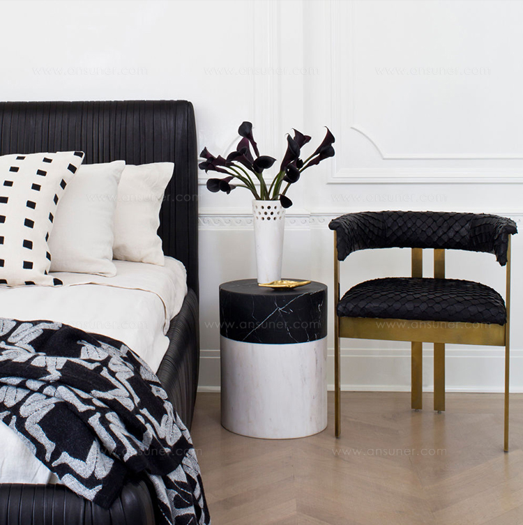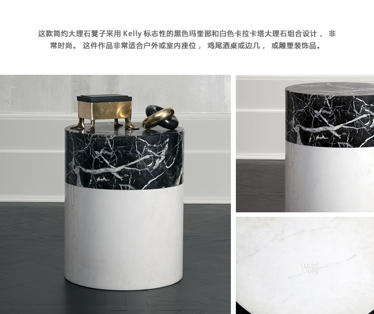 这款简约大理石凳子采用Kelly标志性的黑色玛奎那和白色卡拉卡塔大理石组合设计,非常时尚。 这件作品非常适合户外或室内座位,鸡尾酒桌或边几,或雕塑装饰品。