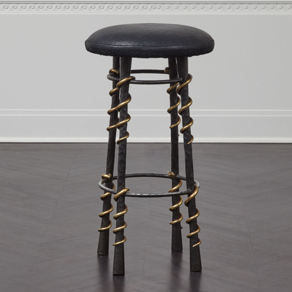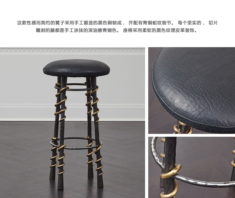 这款性感而简约的凳子采用手工锻造的黑色钢制成,并配有青铜蛇纹细节。 每个坚实的,切片雕刻的腿都是手工涂抹的深油擦青铜色。 座椅采用柔软的黑色纹理皮革装饰。 Serpent Stool采用黑色手工锻造钢材制成,可以采用各种纹理,奢华皮革装饰。
