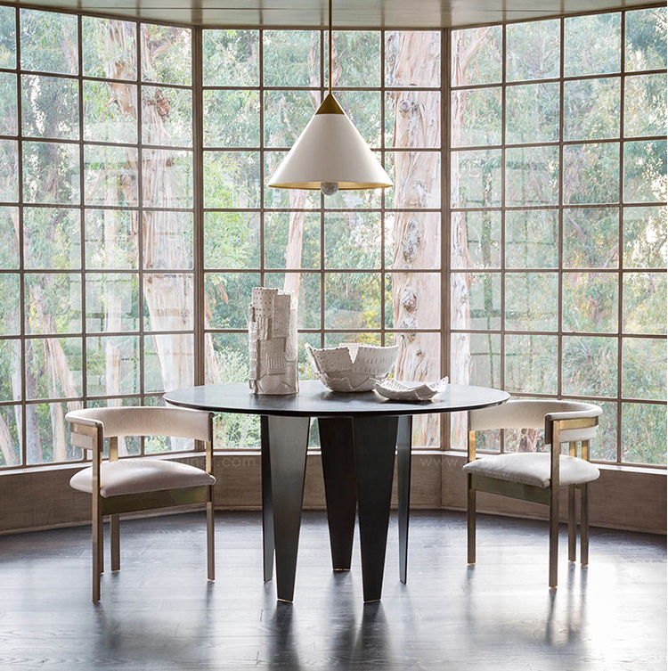 Grafton Dining Table(格拉夫顿餐桌)采用黑色钢质底座和黑色Marquina顶部磨砂密封大理石,并采用反向斜边细节构成,极为精致。 这种雕塑设计借鉴了凯利对几何形状的热爱以及对负空间的巧妙运用。