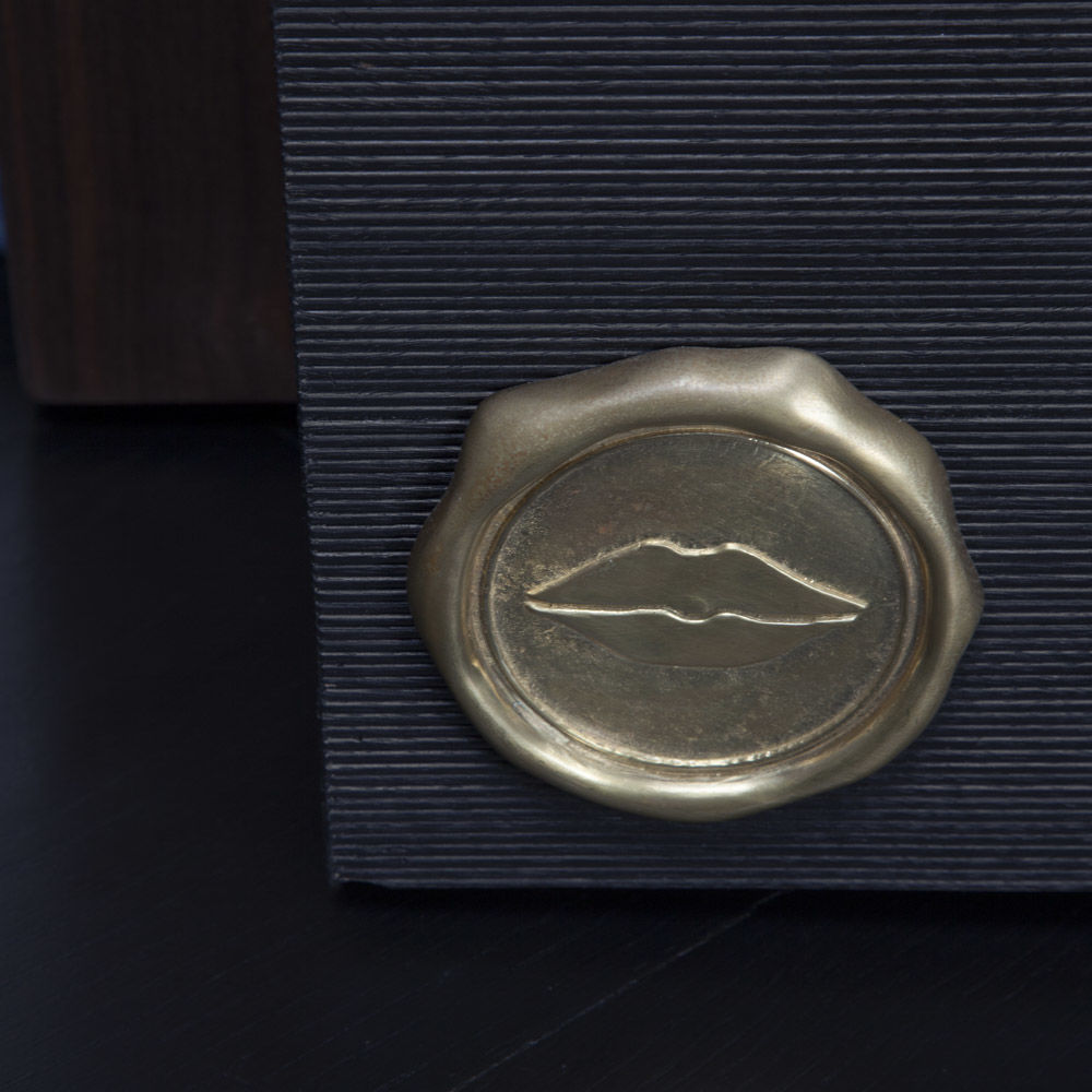 人类最好的朋友应该有一个时髦的住所。由黑色罗纹胡桃木组成,饰有抛光青铜徽章和凯利标志性的亲吻图案细节。