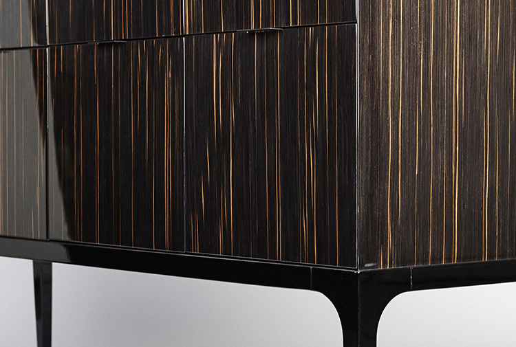 Madia由乌木制成,有七个抽屉和一个开放空间,支撑和镍镀锌金属框架。 利基用皮革覆盖。