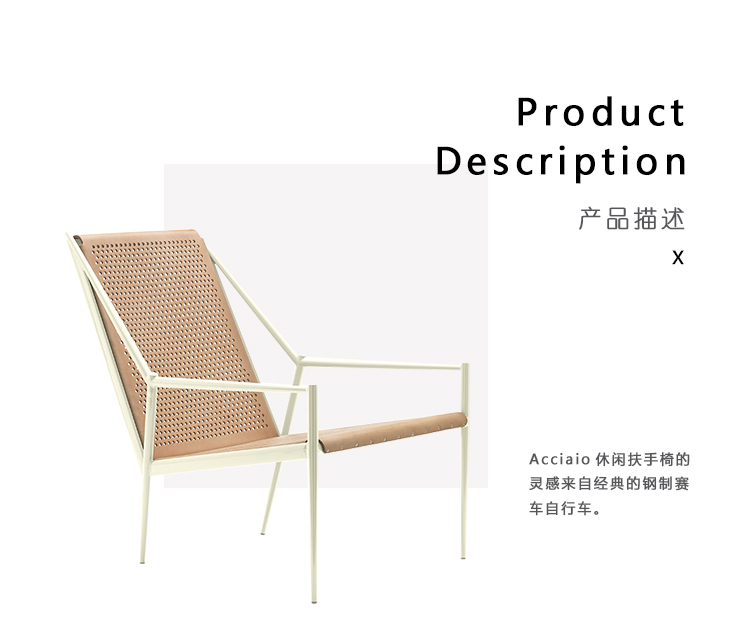 Acciaio Lounge扶手椅的灵感来自经典的钢制赛车自行车。 它由专门的锥形铁自行车管构成,涂有环氧粉末蓝色,红色和黄油,结果非常强烈和轻盈。 座椅和靠背是一个多孔三明治,由天然,棕色或黑色全粒面皮革制成,轻盈,舒适,略带弹性。 Acciaio这个名字来源于意大利语中的“钢铁”,这是对意大利自行车钢材传统的明确提及。 Steel Lounge是一种珍贵的产品,高科技和精湛的工艺完美融合。