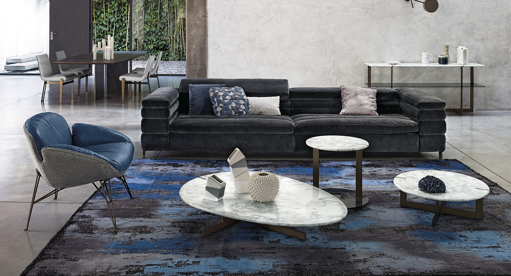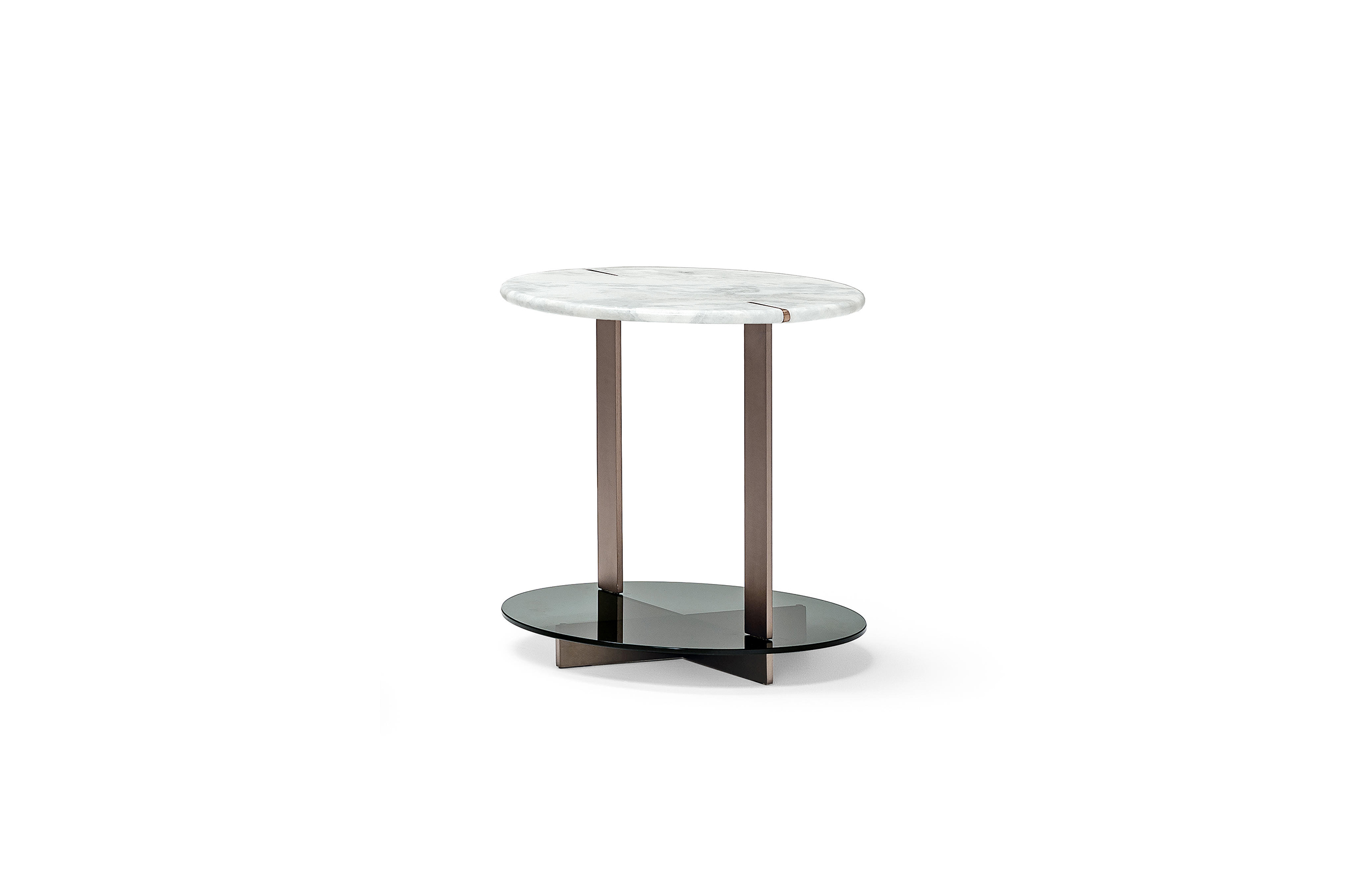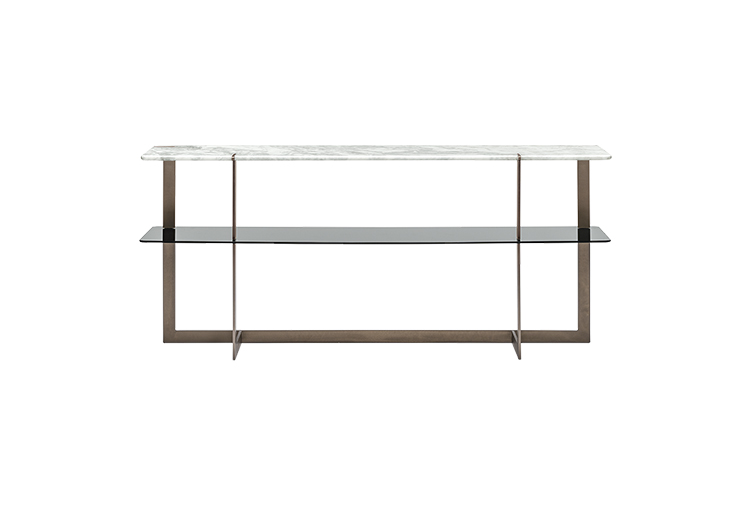 道格拉斯是一个由金属、大理石和玻璃组成的茶几系列。这些桌子可以围绕在沙发周围,因为它们可以放在前面、后面或侧面,可以用作茶几或边几。