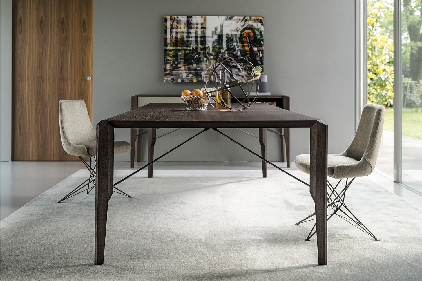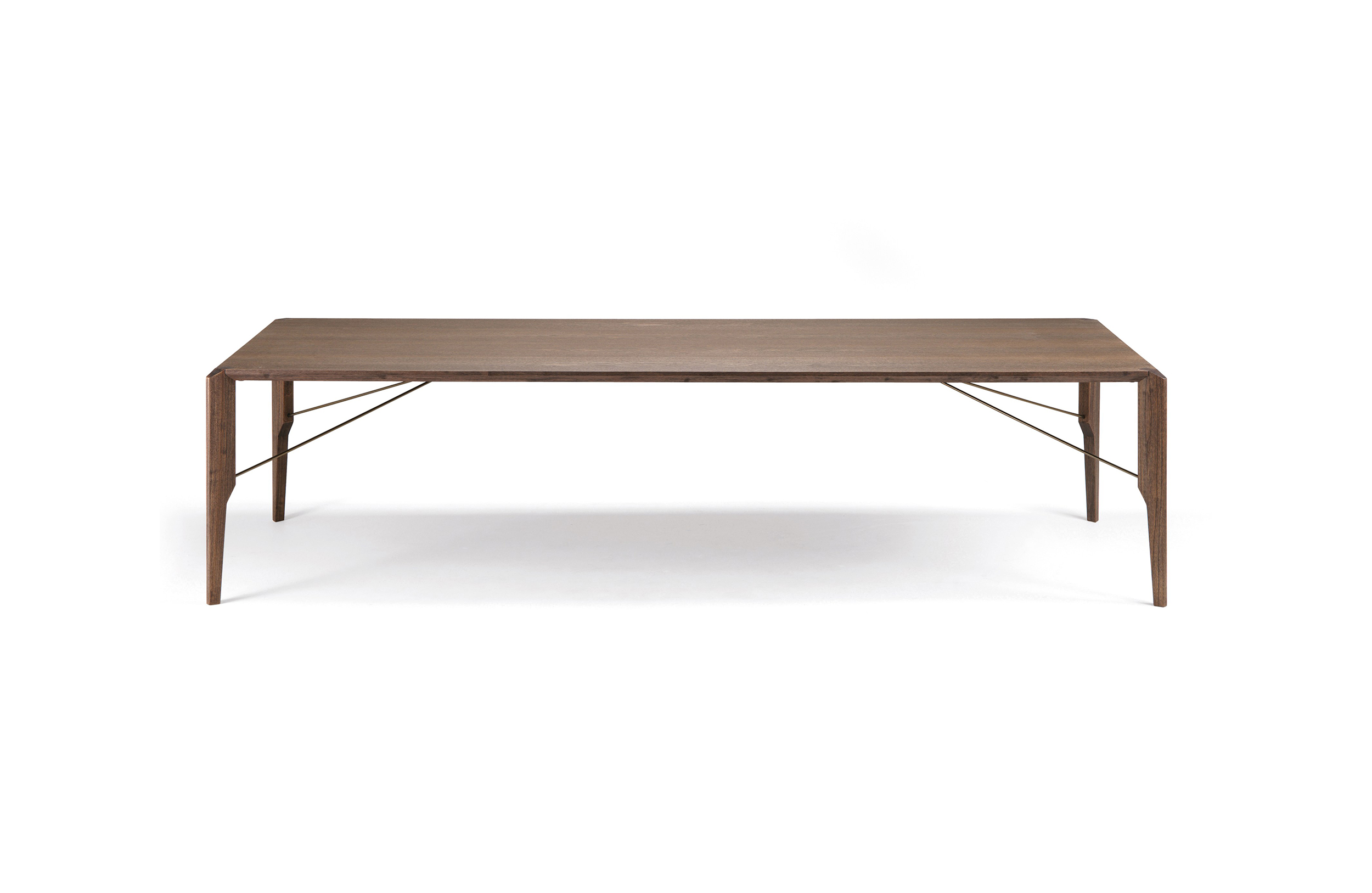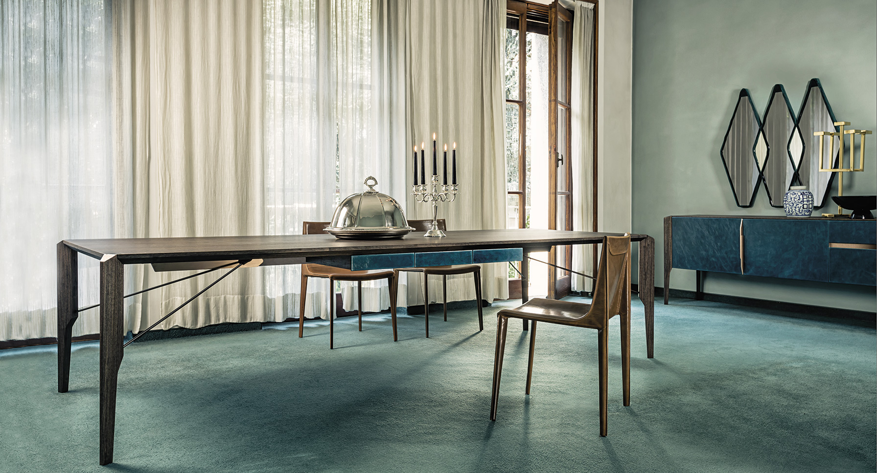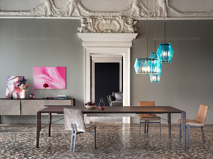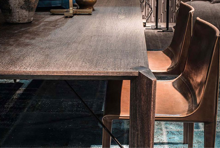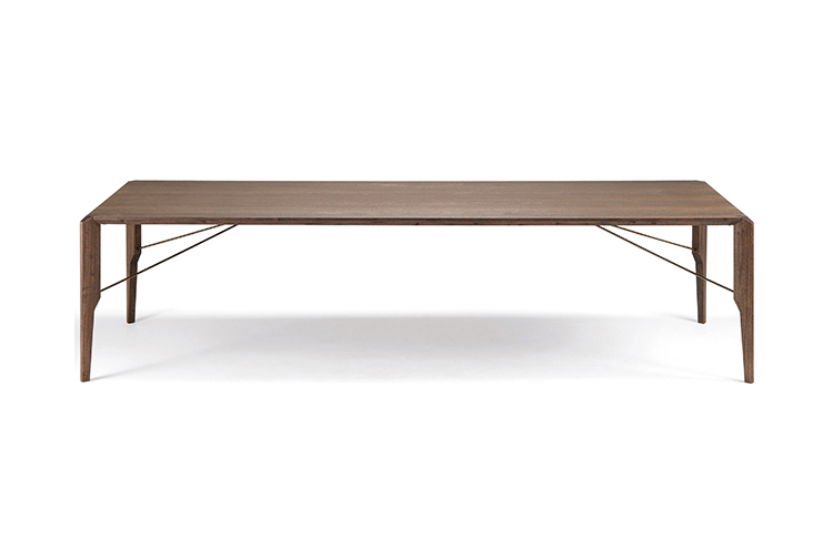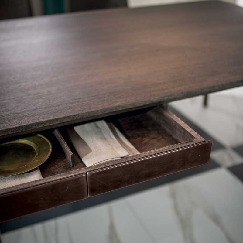 Manzoni&Tapinassi设计的Glorious餐桌运用了最基本的线条设计,以获得极度轻盈的效果。桌面可在摩卡橡木、卡纳莱托胡桃木或苏木皮拉木材中进行选择,桌面下方的抽屉上覆盖有植物鞣制的不同颜色的皮革,可以从强烈的茄皮紫和天然的灰色等各种颜色间进行选择。其独特的特点是每条桌脚上都连接着金属支柱,使其变得薄而又轻盈。