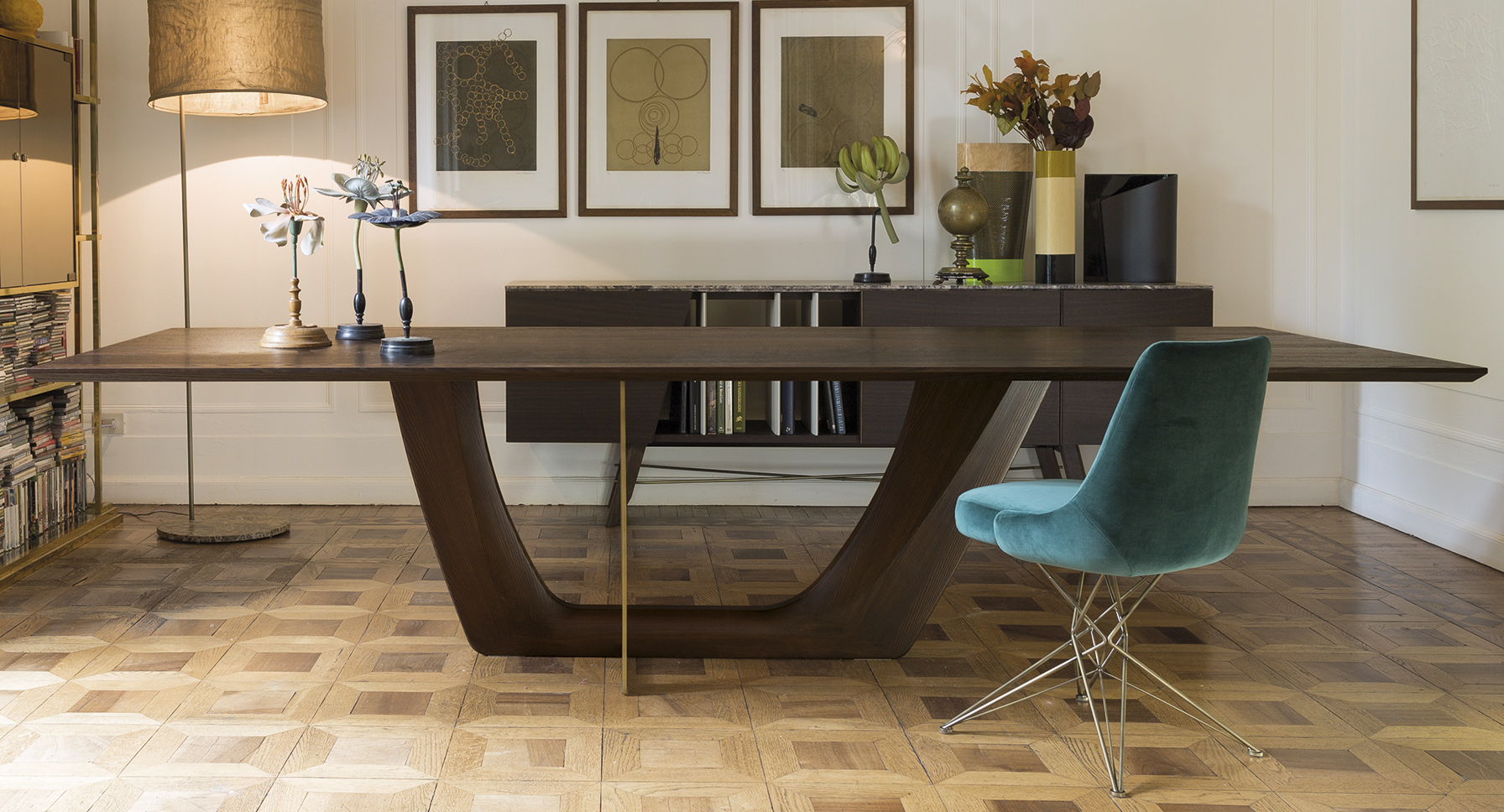 由金属丝制成的轻盈而立体腿部与座椅靠背的结构形成对比,从而在形状和体积之间营造出一种和谐的平衡效果。座椅靠背略微弯曲,将座椅的衬垫包裹起来,以符合人体工程学和动态舒适性。