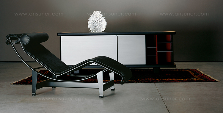 黑色漆光木制储物柜,浮雕外饰和枣红色内饰。抛光铝清漆滑动门。抛光铝清漆内架。该储物柜可使用金属架固定于墙面或配备高/低支脚独立摆放。