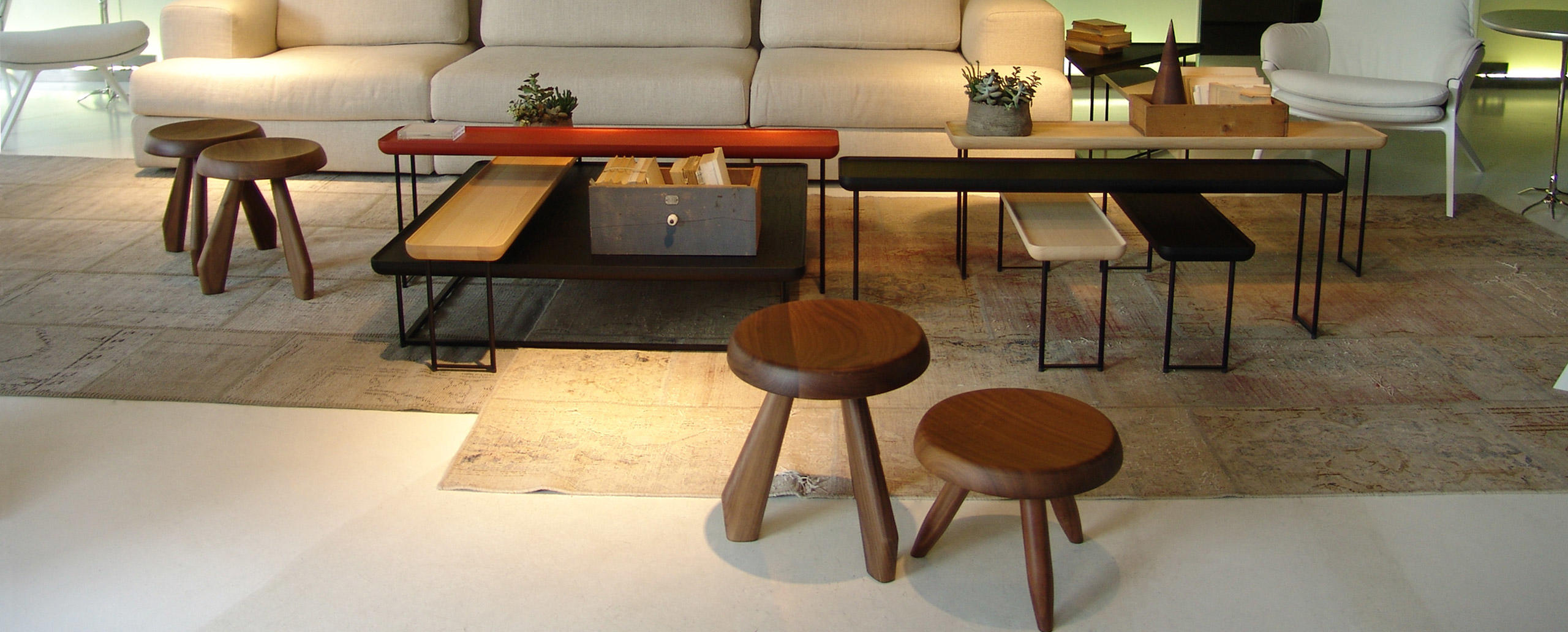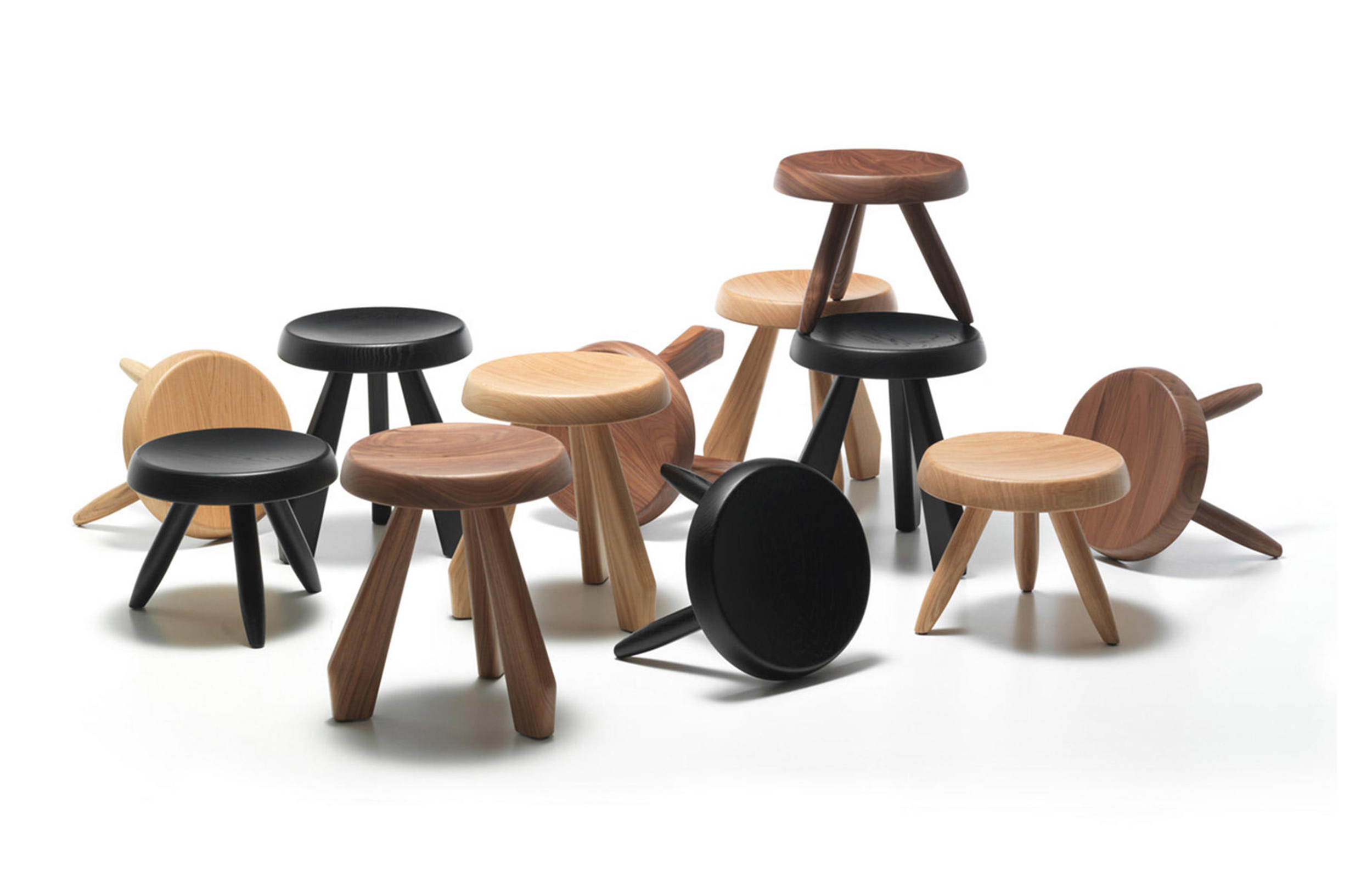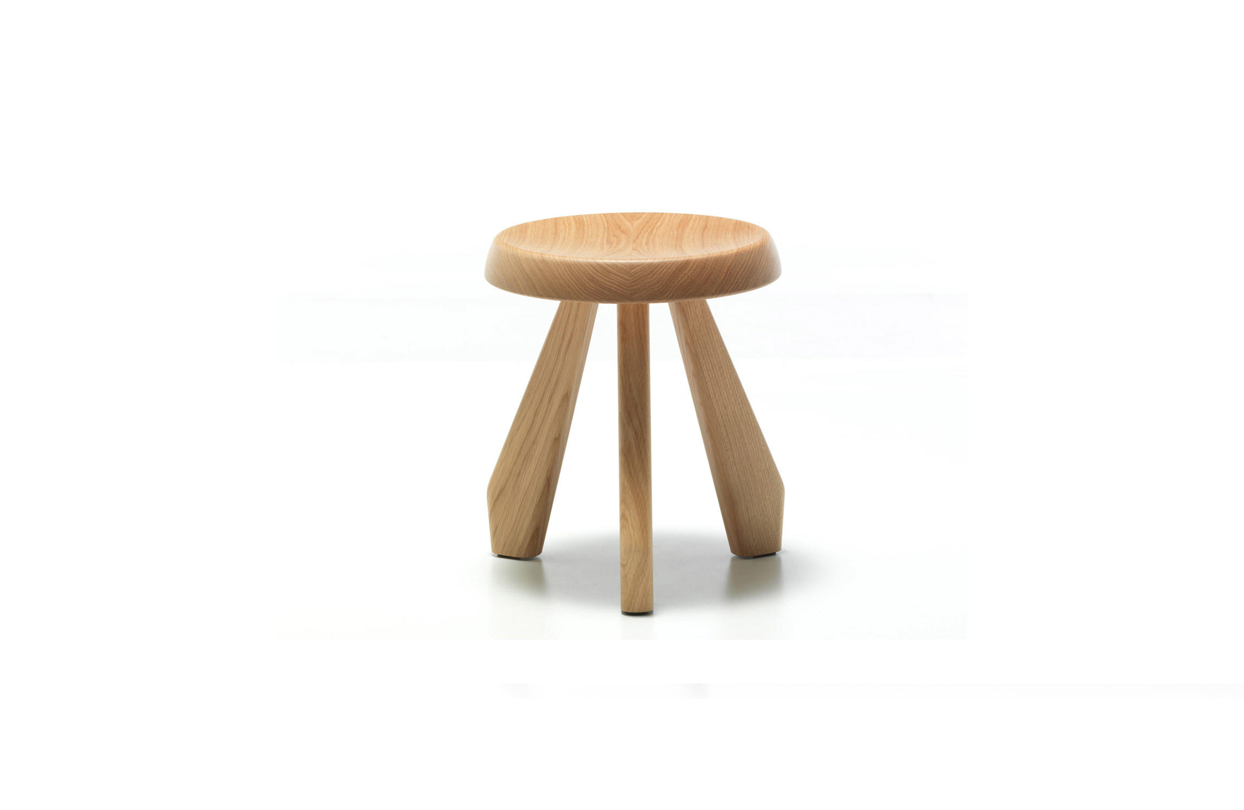 Tabouret Meribel 高脚凳,得名于Charlotte Perriand在法国美贝尔的度假屋。Perriand在这里工作和生活,多年来,她重新诠释了当地的建筑风格。这把凳子材质简单,从阿尔卑斯山的建筑风格中获得灵感。该凳采用三条“刀把型”凳腿,提供三种不同实木饰面:天然橡木、哑光黑色橡木和天然美国胡桃木。