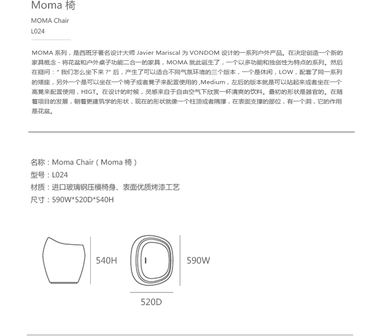 MOMA系列, 是西班牙著名设计大师Javier Mariscal 为VONDOM 设计的一系列户外产品。在决定创造一个新的家具概念-将花盆和户外桌子功能二合一的家具,MOMA就此诞生了,一个以多功能和独创性为特点的系列。然后在疑问:“我们怎么坐?”后,产生了可以适合不同气氛环境的三个版本,一个是休闲的,LOW,配套了同一系列的很舒适的矮座,另外一个是可以坐在一个椅子或者凳子来配置使用的,Medium ,左后的版本就是可以站起来或者坐在一个高凳来配置使用,HIGT。在设计的时候,灵感来自于自由空气下欣赏一杯清爽的饮料。最初的形状是器官的。在随着项目的发展,朝着更建筑学的形状,现在的形状就像一个柱顶或者隅撑,在表面支撑的部位,有一个洞,他的作用是花盆,一个带有VONDOM的自动淋水系统的花盆。其丰富鲜艳的色彩,令这个系列更新鲜,更个性。