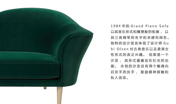 1984年的Grand Piano Sofa以其音乐形式和雕塑般的轮廓,以其三角钢琴的名字和灵感而闻名。 独特的设计语言体现了设计师Gubi Olsen对古典音乐以及柔美女性形式的真正兴趣。 结果是一个沙发,其形式遵循旨在社交的功能。 永恒的沙发设有两个略微向后扶手的扶手,鼓励眼神接触和私人谈话。