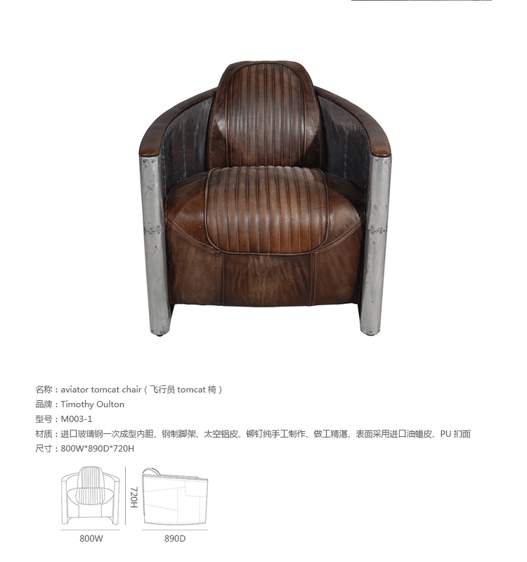 Tomcat系列家具由英国著名设计师Timothy Oulton设计,该系列包括Aviator Tomcat Chair(飞行员Tomcat椅)、Aviator Tomcat 2-seater Sofa(飞行员Tomcat双座沙发)、Aviator Tomcat 3-seater Sofa(飞行员Tomcat三座沙发)。Tomcat系列曾屡获殊荣,灵感来自F-14雄猫式战斗机。 椅子的靠手用铆接铝板制造,弧形线条符合空气动力学,有如一双机翼,座垫和靠背则使用柔软仿古皮革制造,好像飞行员夹克。