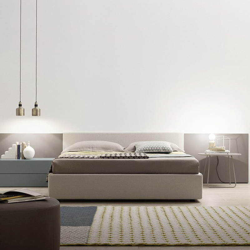 不同宽度和高度的圆形嵌板,不同颜色的织物组合,浮动的书架和有抽屉的床头柜:用Lota系列为你的卧室增添你的个人风格。