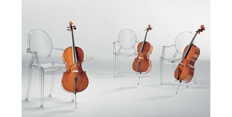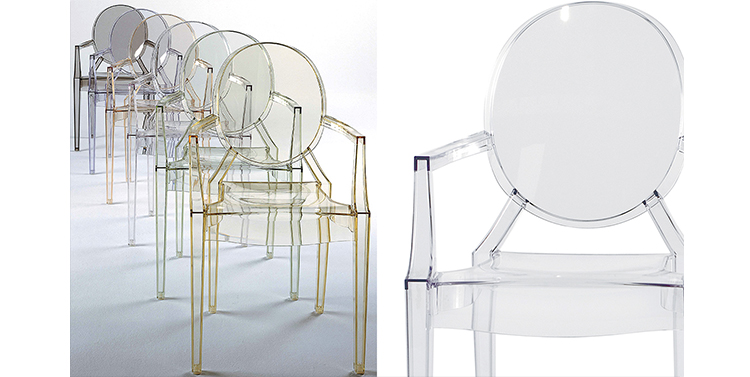 ouis Ghost 是以透明彩色的聚碳酸酯為材質,並有路易十五時期的巴洛克式風格,堪稱世上最大膽的使用聚碳酸脂注入模型中之作。儘管外觀上看起來纖細且透明如水晶一般,但實際上 Louis Ghost 卻是穩固且耐用的,經得起搬動、刮傷及天候的轉變,在收藏上,Louis Ghost 可以堆疊到六個之多。無論放在任何風格的住家或公共空間,Louis Ghost 皆能吸引眾人的目光並帶點優雅與反諷。