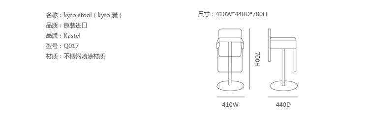 Kastel是一个在室内装饰领域极具影响力的公司,该公司具备高水平的综合生产能力,是一个充满活力的公司。Kastel公司产品多种多样,包括办公座椅,社区座椅和家庭座椅等等。Kastel在对人体工程学进行深刻研究之后,制定了现在的生产线,产品的设计以舒适为主,在生产过程中每一步都严格遵循这一宗旨,为客户提供高性能的产品,满足客户对舒适的基本要求。这也是Kastel公司的经营理念。kyro stool(kyro 凳)设计独特新颖,清新自然,高度可调旋转,不锈钢喷涂材质,是酒吧、餐馆、客厅现代风格吧椅。