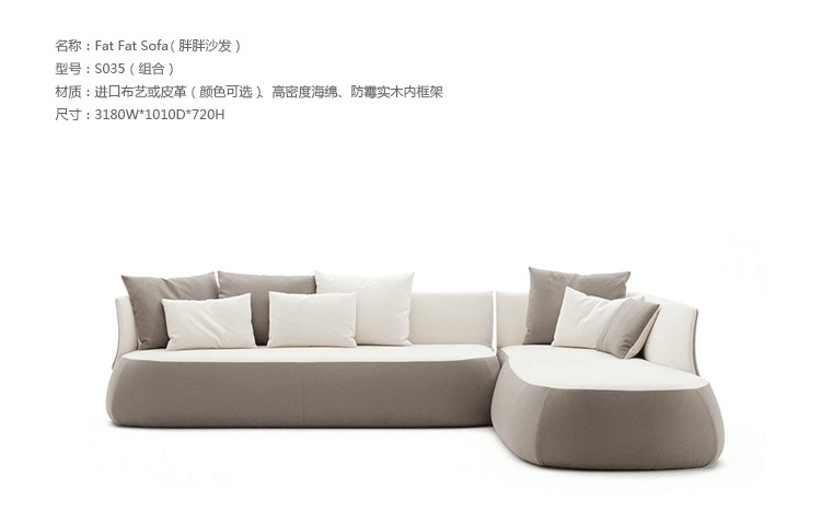 Fat 座椅系列是由西班牙女设计师Patricia Urquiola于2002年为 B&B Italia公司设计的。在最初设计的Fat-Fat功能家具是一种即可当桌又能作储存之用的咖啡桌,之后则又发展成为Fat-Fat 床。又呈现出一款相同圆润、柔软且具有蜿蜒形态的座椅系列,其包括有不同的形态:从直线型沙发到有转角的沙发,从具有两种高度的扶手椅到长椅和软凳。