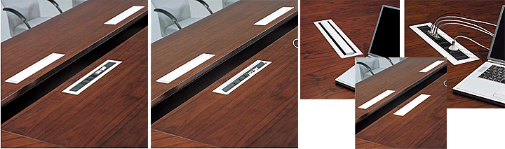 ※ 会议桌的过线系统介绍:此款会议桌可以选择如图的手动线盒、电动线盒、以及毛刷翻盖线盒,适合你不同的办公需要,内部可配置动功能三插电源孔、网络接口、耳机音频接口、话筒接口、VGA接口,也可根据客户实际需要选择和定做。