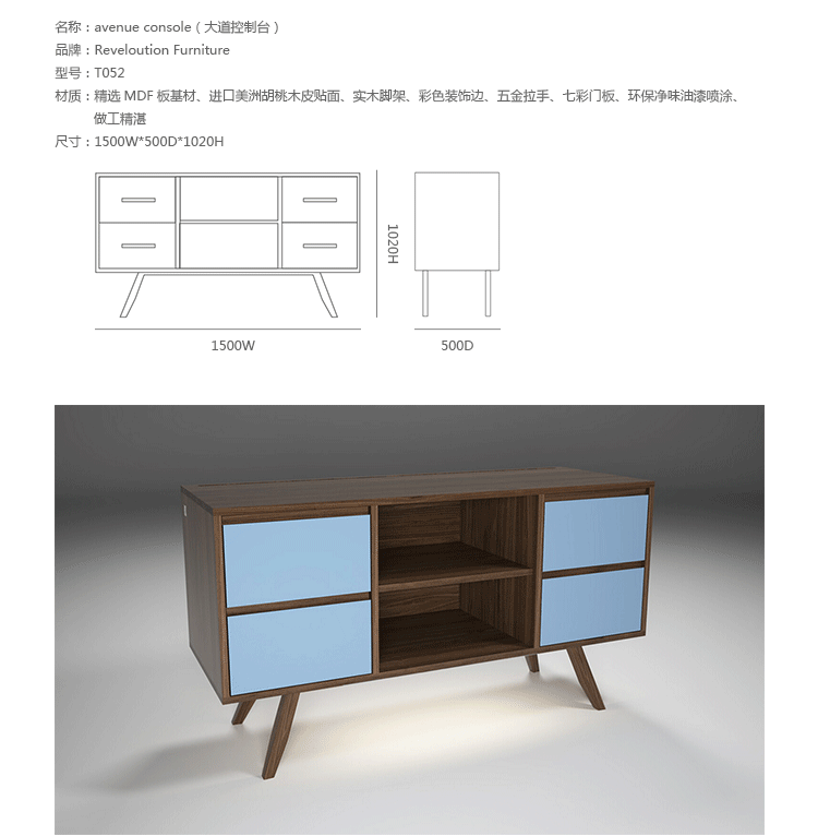 avenue console(大道控制台)有很多用途,可以用来收纳,当做娱乐控制台或自助餐台等等功能等着您去合理的利用。制作采用精选MDF板基材、进口美洲胡桃木皮贴面、实木脚架、彩色装饰边、五金拉手、七彩门板、环保净味油漆喷涂、做工精湛。