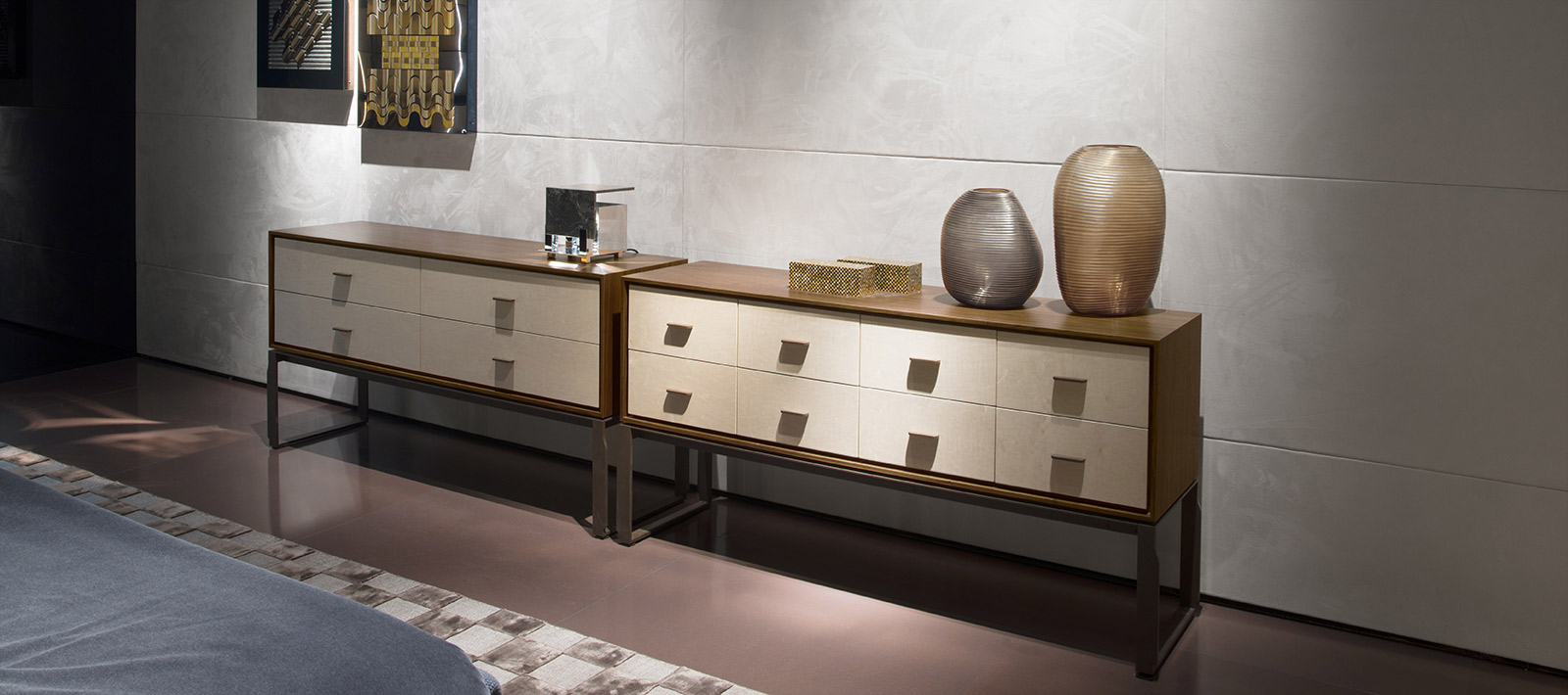 4或8抽屉衣柜在核桃卡纳莱托木(fin.11)。 抽屉方面都有两个版本:白色小提琴状的东西画梧桐或者金箔装饰。 抽屉里配有沉默系统总提取后退指南。 处理和金属基体上铜的颜色。