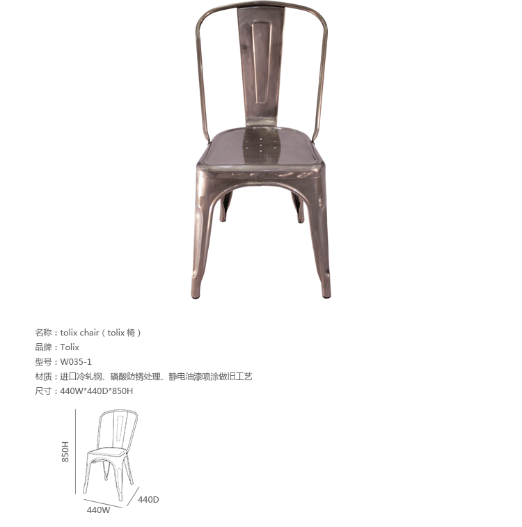 tolix chair(tolix椅)一把有味道、有态度的椅子,据说它最开始被使用在一艘战舰的天气预报房间里,故事的真实性与否不得而知,但是不影响其成为享誉世界的著名设计家具,1934年由Xavier Pauchard设计,早期是作为户外用家具设计,力图展现法式慵懒而闲适的气质,经年而来被全世界时尚设计师所宠爱,从室外扩展到家居、商业、展示等多个用途,而此椅也不负众望在各类空间中均有上佳表现,特别是近年来与混搭、乡村、美式、怀旧、北欧简约、中式等主要装修风格搭配,都呈现出独特的韵味,也被时尚界赞为“百搭第一”椅,可以用在酒吧,餐馆,咖啡馆等等地方,之后通过改进,设计出有扶手版本的tolix armchair(tolix扶手椅),高背版本的tolix high back bar stool(tolix高背吧凳),宽背版本的tolix wide back bar stool(tolix宽背吧凳),及tolix bar stool(tolix吧凳)和tolix mini stool(tolix迷你凳)。制作采用进口冷轧钢、磷酸防锈处理、静电油漆喷涂工艺、坐面为木板或PU海绵坐垫,颜色可选。