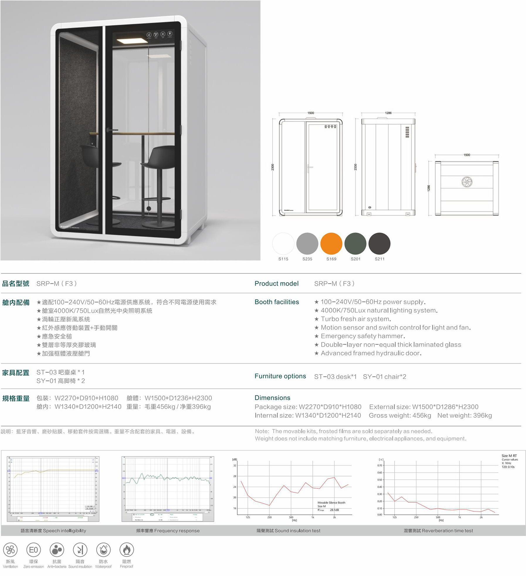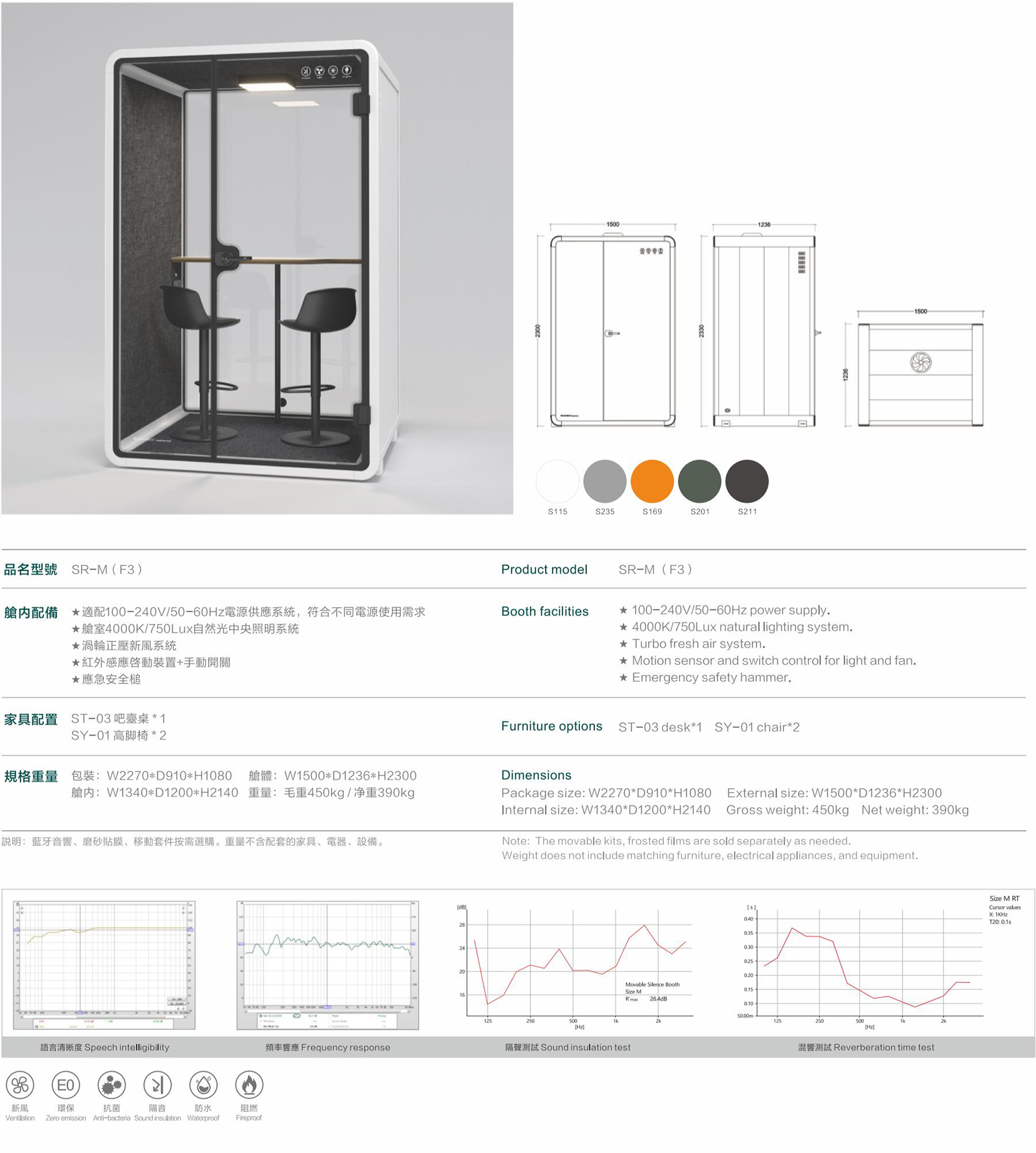 一个灵动的安静空间,满足您无限创想不传统的碳塑复合板、航空铝、隔声玻璃是它的主要组成,SOLIDWORKS软体力学建模让仓体组装仅需一种紧扣件,INSULMARSHALL ACOUSTIC 声学模拟设计准确预知并实现了舱体隔音和舱室音环境指标,它是一个强大,尽管它不是最完美的迷你空间,仓体采用可循环碳塑再生材料 SR系列 静音仓推崇低碳、简约、安全、实用主义优化非必要的功能和配置。从薄的全R角外观和互雅配色让它更精致、融入环境。