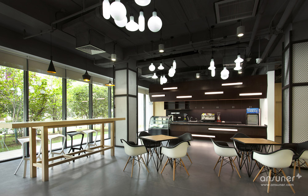 在一楼的沿窗休闲讨论区里,整面墙采用绿植装饰,与室外的绿化相呼应。咖啡厅的效果以简洁为主,地面采用了耐磨及耐清洁的灰色调地坪漆,家具及材料的选择也以暗色调为主,以迎合咖啡的色调。办公区内的茶水区是员工讨论休闲的区域,整个色调的运用营造出温馨放松的空间氛围。