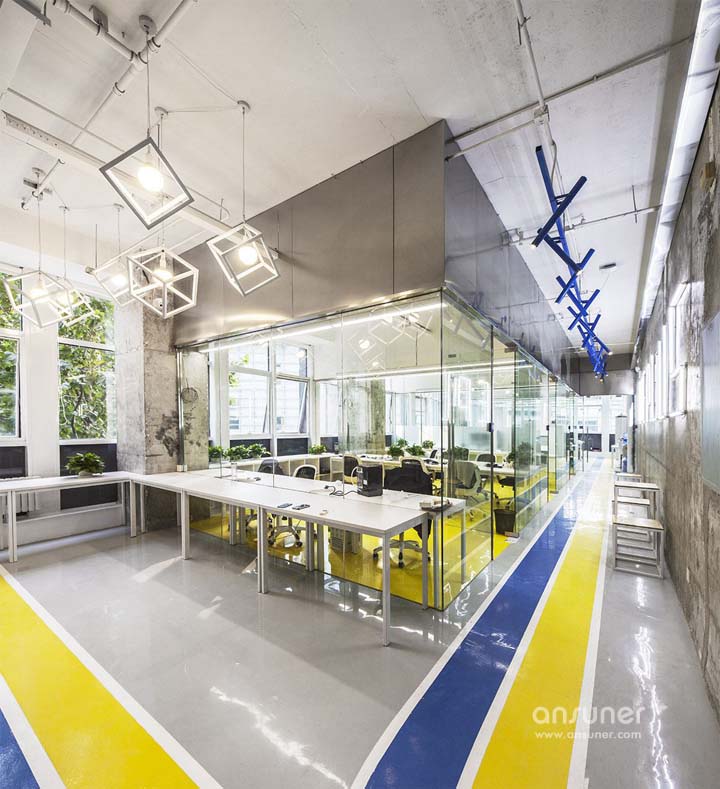 在空间架构上,设计以“植入”小盒子的方式营造较为私密的会议室和办公室。如在二层和地下室,以欧松板制作的模块化家具界定了空间格局;以2.4米高的透明玻璃分隔出独立办公室。独立空间明亮的地面色彩也再次强化“植入”的概念表达。秉承这一设计思路,远离墙体的家具设计亦暗示了联合办公空间的即时性、灵活性和可变性。