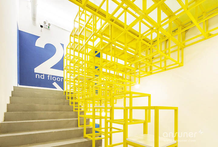 以“展示”为设计元素的首层空间继续向上延伸:通向二楼的楼梯间创意性的设计了一系列悬浮的黄色立方体金属框架装置。这些框架即起到护栏与装饰作用,同时将人们引入楼梯的尽端,一间透明的冥想空间。人们在这里理清杂乱的思绪,获得清明的思维,也许创意就在这里点燃爆发,这也是本案的一大设计亮点。