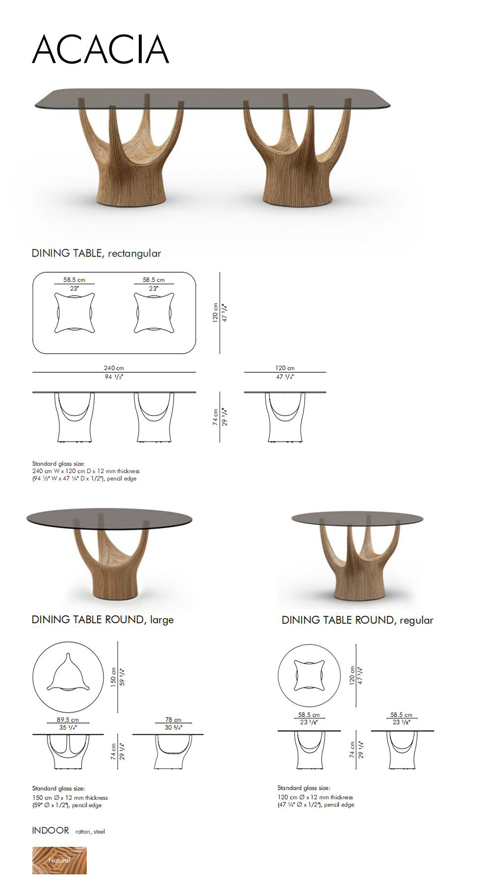 acacia藤制桌子系列的灵感来自古老的猴面包树,由藤杆固定在一起,创造出雕塑般流畅的轮廓。自然原始的藤条组合与更为流线型和简约的桌面形成鲜明对比。