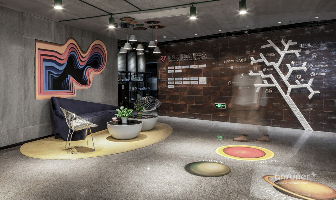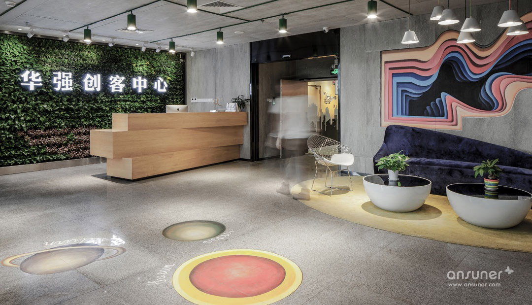 华强国际创客中心是为开发者和创业者提供的交流和共享空间,该创客中心的设计完全遵照LEED白金标准创建。办公室的内部以LOFT风和 自由简洁爲设计主导,黑白灰则为整个空间的主色调,多彩的家具和饰品为辅。还在空间中融入和集成图形匹配,充分体现了现代办公的绿色环 保、人性化的办公空间理念。
